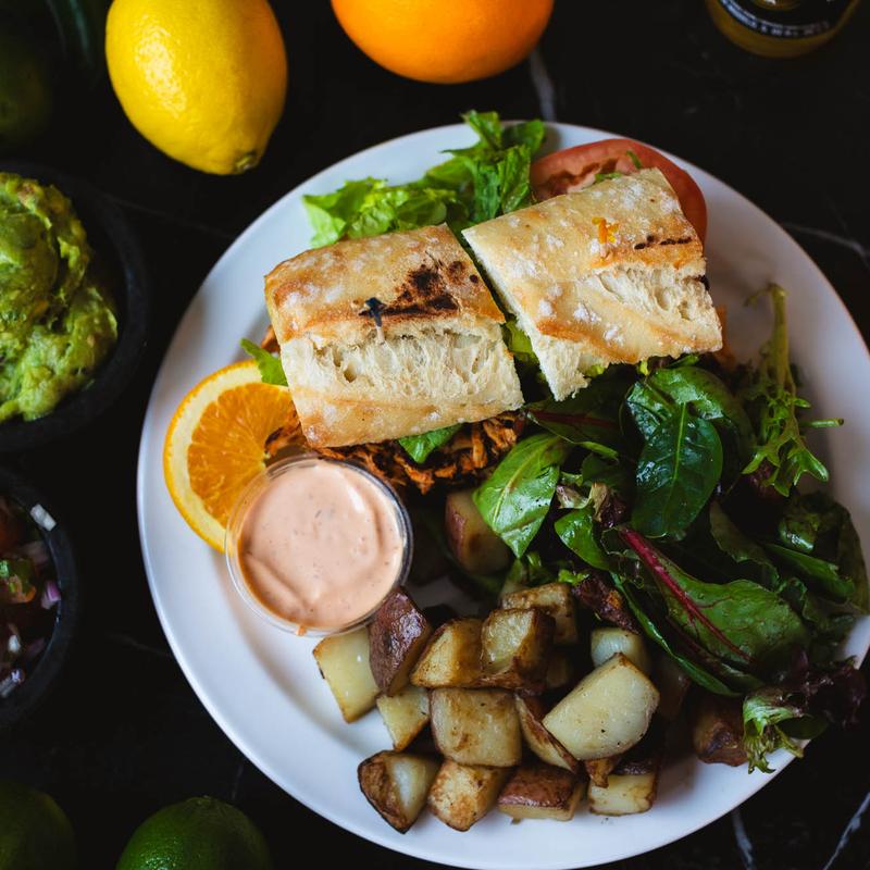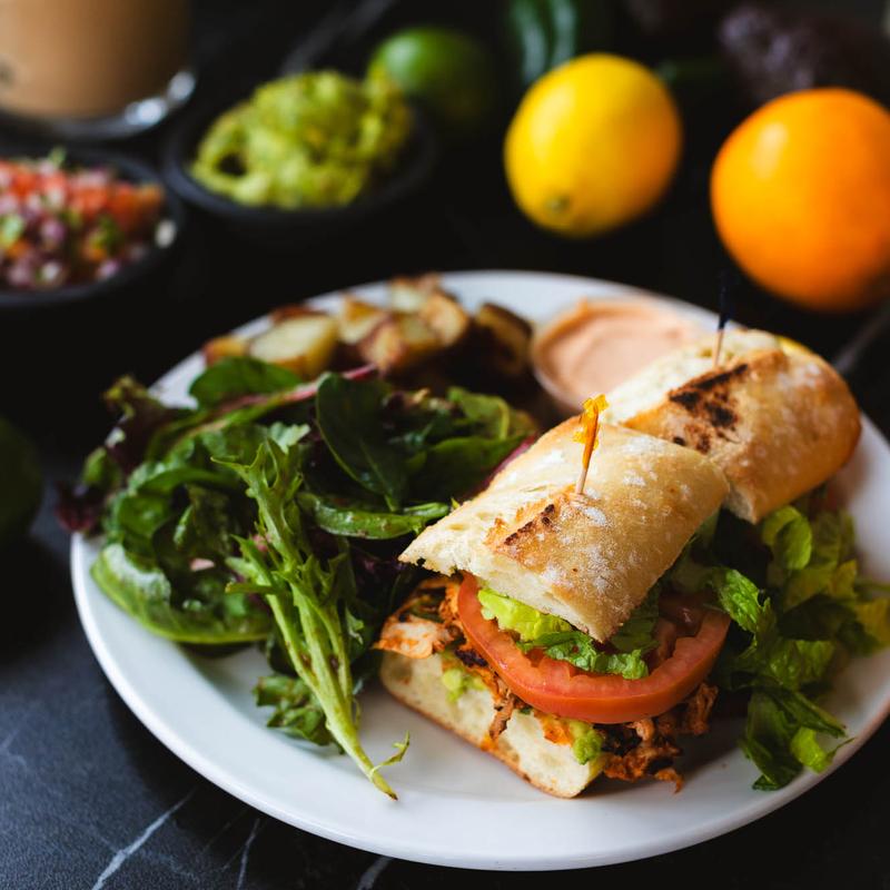 Guacamole, tomatoes, greens, hot rotisserie chicken sauteed in chipotle salsa on a toasted fresh white baguette. Comes with side chipotle mayo + your choice of side • Sub Gluten Free +$3.90