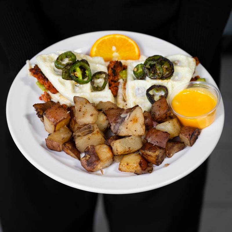 2 egg white waffles with guacamole, chorizo (vegan or pork), grilled jalapeños with Hollandaise sauce on side + your choice of side.