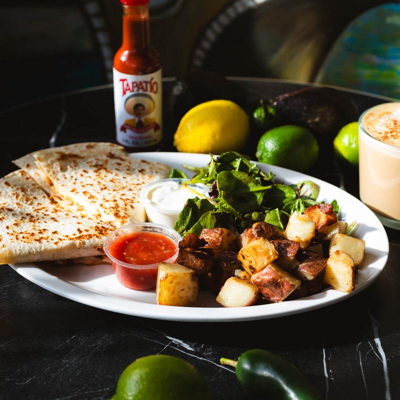 Flour tortilla with your choice of chicken, chorizo (pork or vegan), or vegetarian, with cheese, red salsa and sour cream + your choice of side • Sub Gluten Free +$3.90