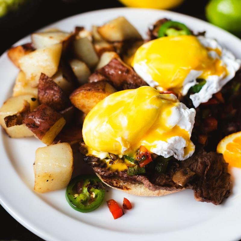 2 poached eggs with skirt beef steak, sautéed mushrooms, red and green pepper, onion and jalapeño. Topped with Hollandaise + your choice of side | 3 Eggs Vaquero Benedict $33.9