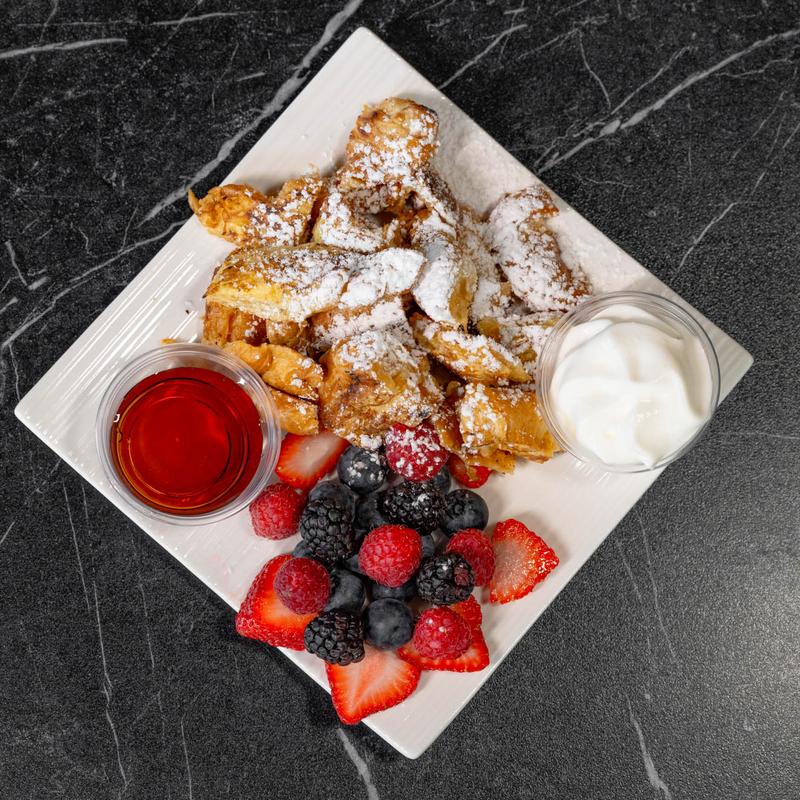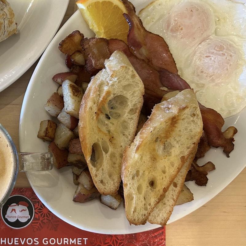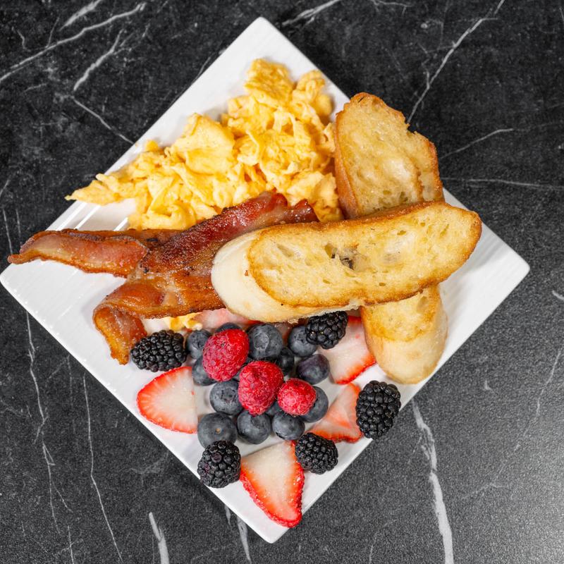 2 eggs any style, bacon, and toasted baguette + your choice of side • Sub: Peameal Bacon (2 pcs) +$3.30 | Chorizo (Pork) or Vegan Chorizo +$4.30 | Rice Bread (Gluten Free) +$3.90