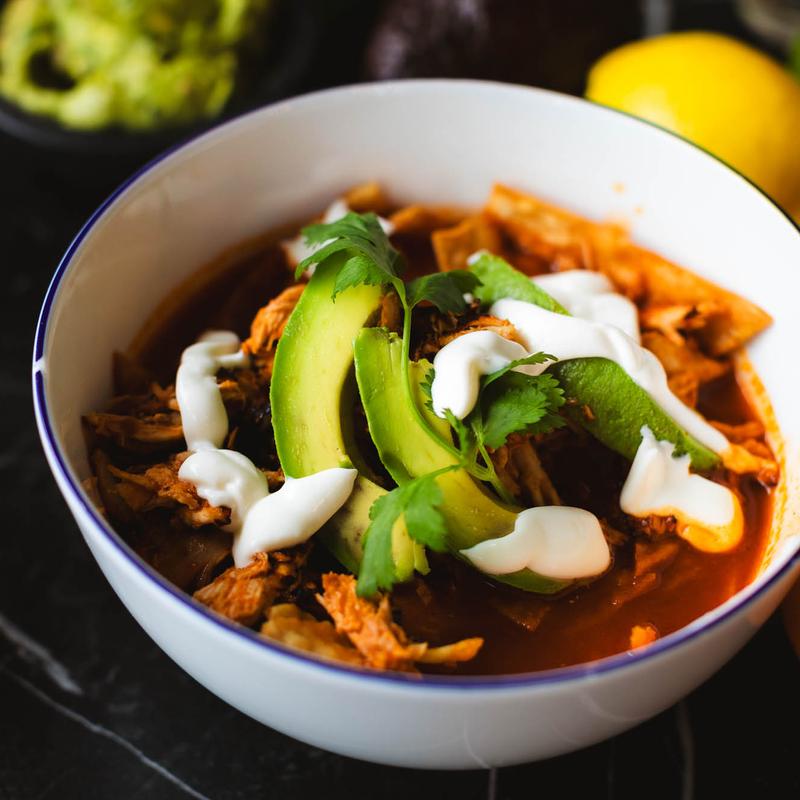 A traditional Mexican tomato based soup with gluten free tortilla chips, pulled chicken, avocado, cheese and sour cream.