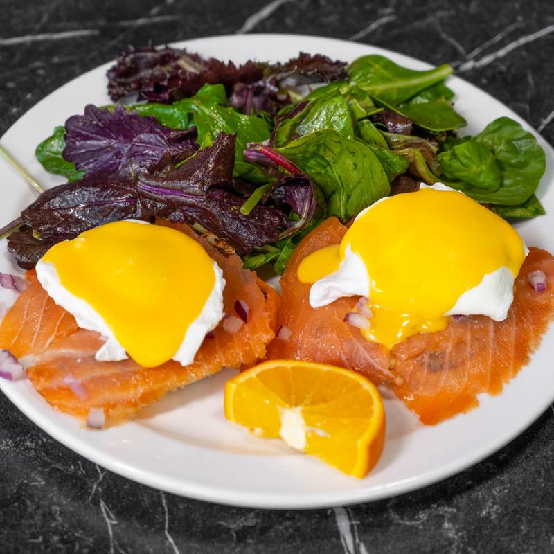 2 poached eggs, smoked salmon and red onion on a toasted English muffin with Hollandaise sauce + your choice of side | 3 Eggs Salmon Benedict $28.00 • Sub Gluten-Free Rice Bread +$3.90