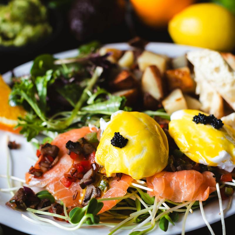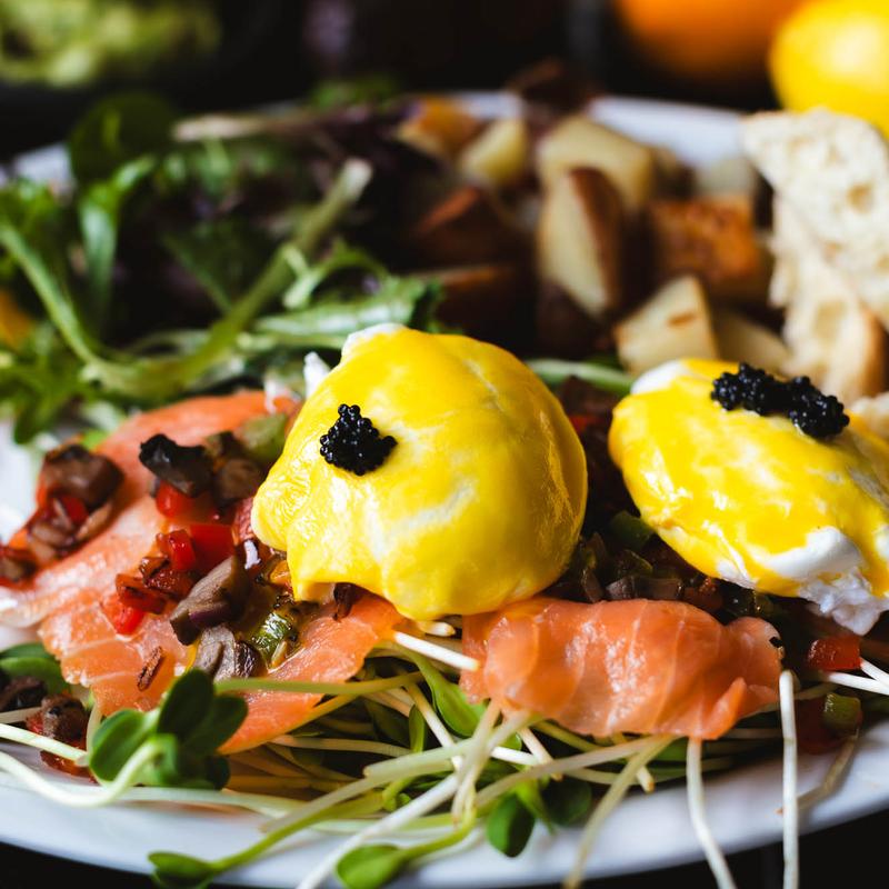 2 poached eggs with smoked salmon base, sautéed green and red peppers, mushrooms, fresh sunflower micro greens. Topped with bright Hollandaise and caviar + baguette and your choice of side.