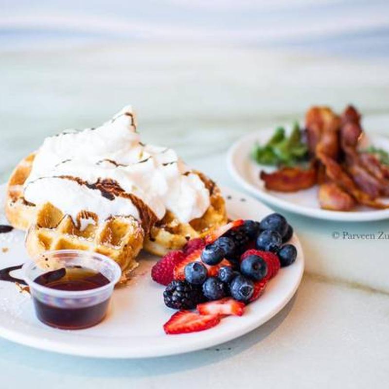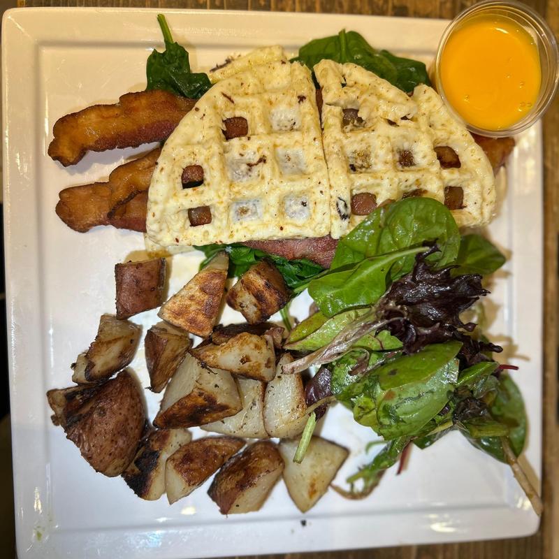 2 egg white waffles with spinach, avocado and bacon topped with Hollandaise sauce on side + your choice of side
