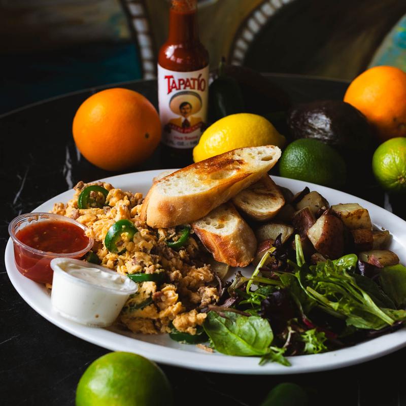 Scrambled eggs with grilled chorizo (pork or vegan), jalapeño peppers and red onion on a soft corn tortilla. Comes with red salsa, sour cream and toasted baguette + your choice of side • Sub Gluten Free +$3.90