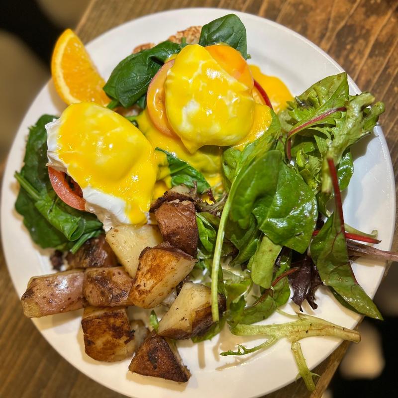 2 poached eggs, wilted spinach and 2 slices of tomato on a toasted English muffin with Hollandaise sauce + your choice of side | 3 Eggs Florentine $22.00 • Sub Gluten-Free Rice Bread +$3.90