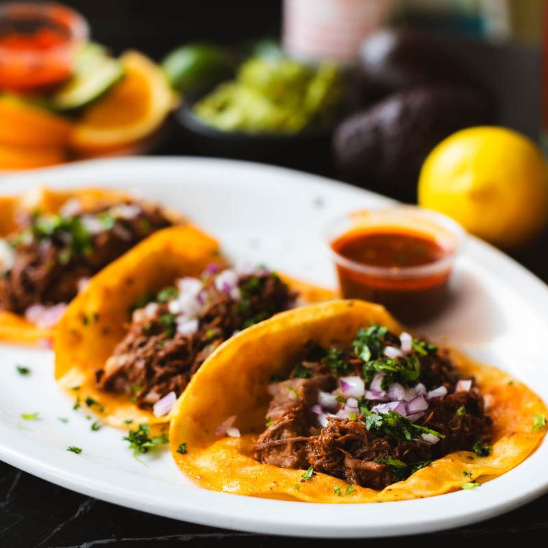 Pull skirt beef on a corn tortilla with refried beans, coriander, onions and consommé.