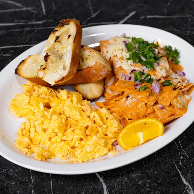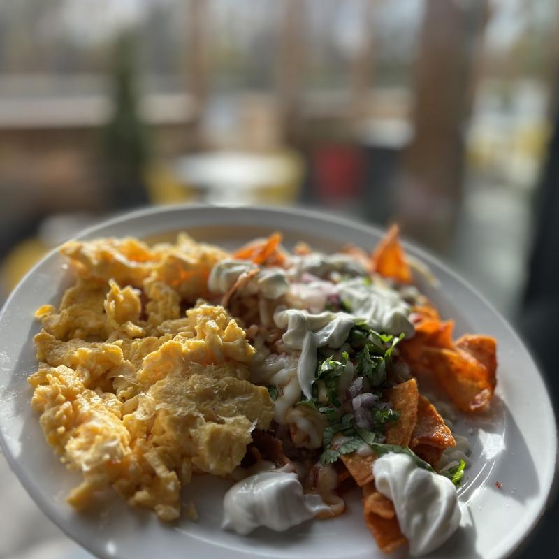 Homemade fried corn tortilla chips with red or green salsa, cheese and topped with two scrambled eggs. Comes with a side of sour cream. ADD - Chorizo (Pork), Vegan Chorizo or Chicken- +$4.3 ADD Birria or steak - +$630