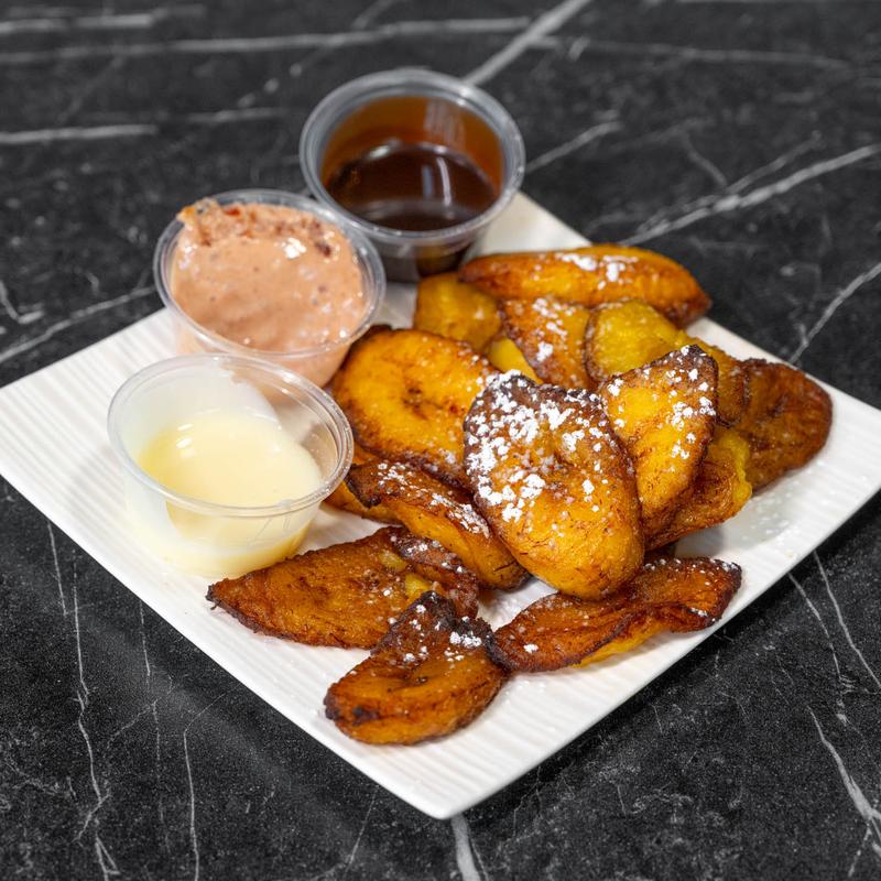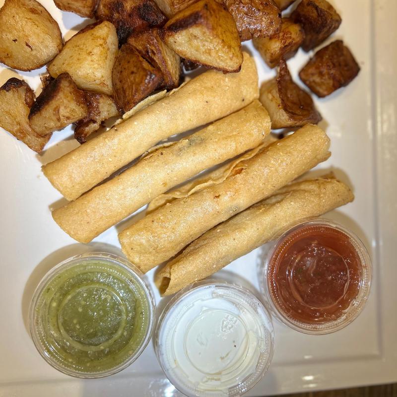 4 rolled fried tortillas with chicken, and sour cream with your choice of red salsa or green salsa + your choice of side.