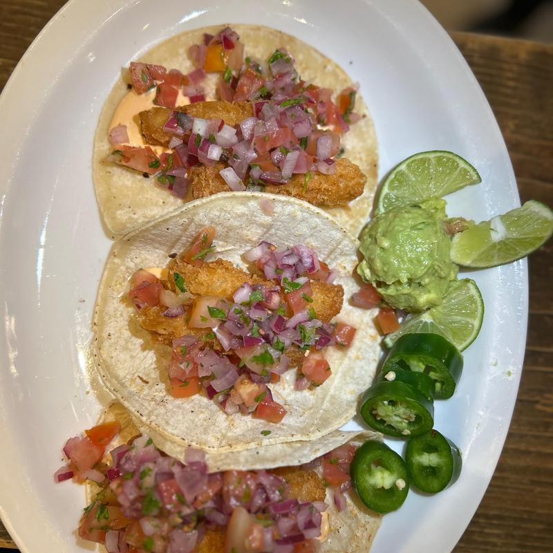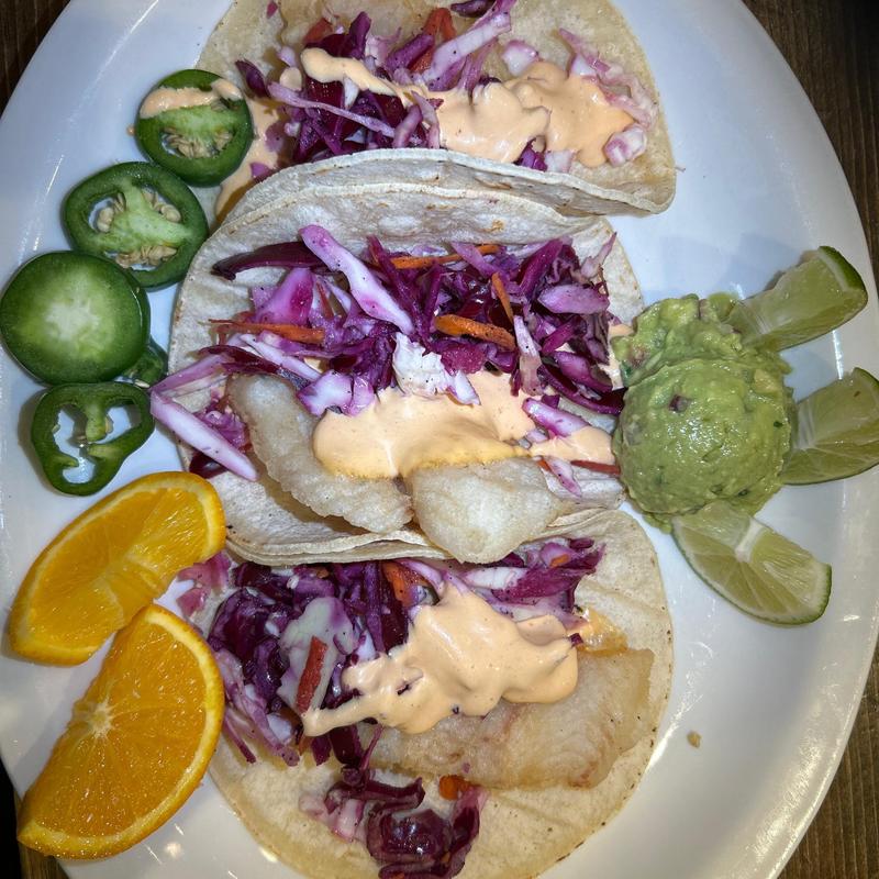 Chipotle mayo, coleslaw, fried sole fish, raw jalapeño peppers side of guacamole and lime wedges.